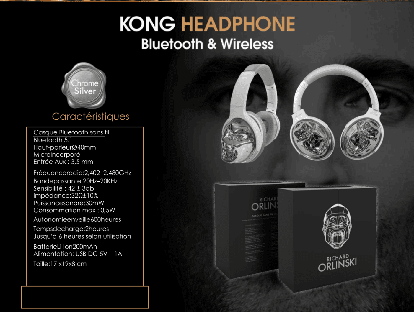 Le Casque Kong Argent brille autant qu'il sonne. Sa surface miroir capte et reflète chaque source lumineuse, transformant l'accessoire en objet de désir à part entière. La signature géométrique d'Orlinski se prête à merveille à cette finition précieuse, digne des grandes collections d'art contemporain.
