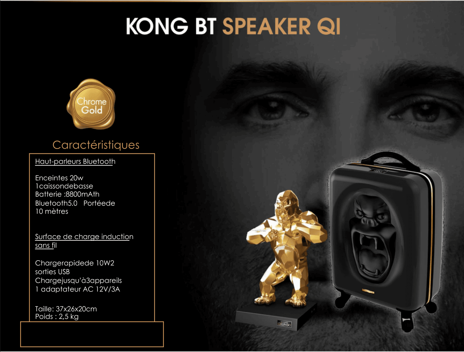 Le Speaker Kong Or est une déclaration. Sa finition dorée brillante évoque les grandes sculptures monumentales tout en restant résolument contemporaine. Posé dans un salon, un bureau ou une galerie, il impose le respect et la contemplation. Une pièce de collection absolue.